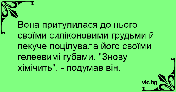 Вона притулилася до нього своїми силіконовими грудьми й пекуче поцілувала його своїми гелеевимі губами. "Знову хімічить", - подумав він.