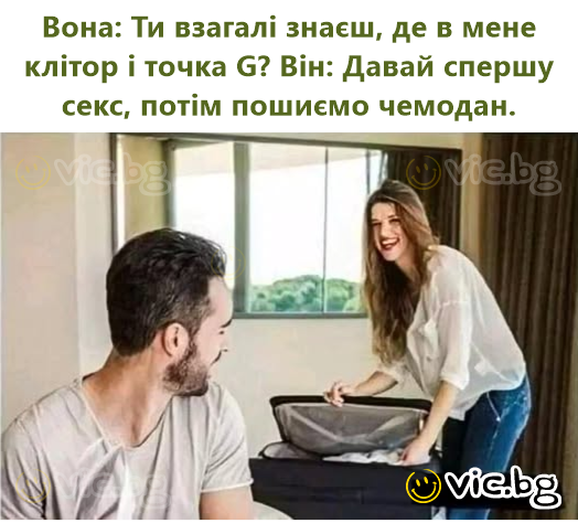 Тя: Знаеш ли изобщо къде ми е клиторът и G-точката? Той: Първо да правим cekc, после ще търсим в куфара.
