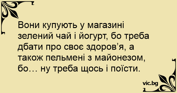 Вони купують у магазині зелений чай і йогурт, бо треба дбати про своє здоров’я, а також пельмені з майонезом, бо… ну треба щось і поїсти.