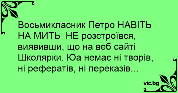 Восьмикласник Петро НАВІТЬ НА МИТЬ НЕ розстроївся, виявивши, що на веб сайті Школярки. Юа немає ні творів, ні рефератів, ні переказів...