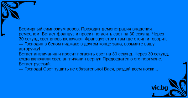 Всемирный симпозиум воров. Проходит демонстрация владения ремеслом. Встает француз и просит погасить свет на 30 секунд. Через 30 секунд свет вновь включают. Франзцуз стоит там где стоял и говорит: