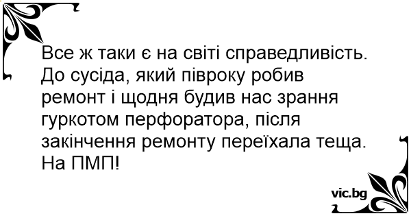 Все ж таки є на світі справедливість. До сусіда, який півроку робив ремонт і щодня будив нас зрання гуркотом перфоратора, після закінчення ремонту переїхала теща. На ПМП!