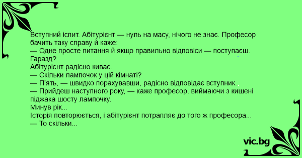 — Ні, професоре, — каже абітурієнт і дістає з кишені шосту лампочку...