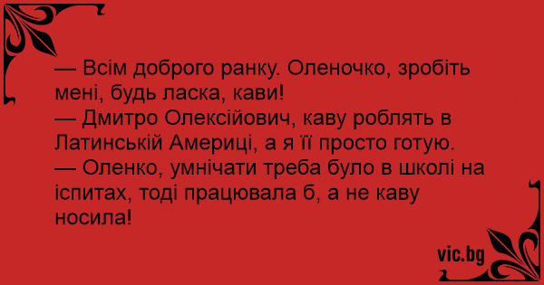 — Оленко, умнічати треба було в школі на іспитах, тоді працювала б, а не каву носила!