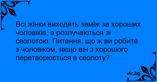 Всі жінки виходять заміж за хороших чоловіків, а розлучаються зі сволотою. Питання: що ж ви робите з чоловіком, якщо він з хорошого перетворюється в сволоту?
