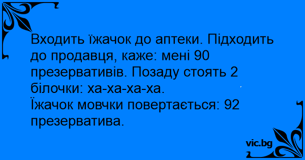 Входить їжачок до аптеки. Підходить до продавця, каже: мені 90 презервативів. Позаду стоять 2 білочки: ха-ха-ха-ха.