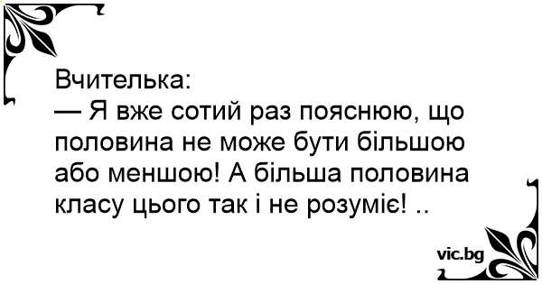 — Я вже сотий раз пояснюю, що половина не може бути більшою або меншою! А більша половина класу цього так і не розуміє! ..