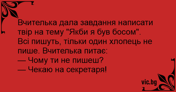 Учениците добиваат состав за писмена работа: "Што би направиле доколку сте директор"? Сите ученици пишуваат само малиот Трпе седи и чека. Учителката налутено го прашува: - Зошто не пишуваш? - Чекам да дојде секретарката да и издиктирам.
