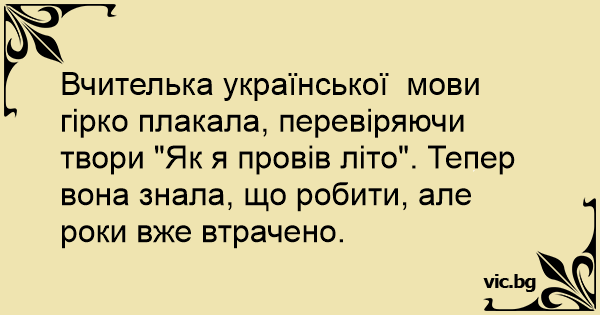 Вчителька української мови гірко плакала, перевіряючи твори "Як я провів літо". Тепер вона знала, що робити, але роки вже втрачено.