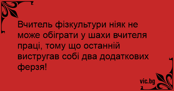 Вчитель фізкультури ніяк не може обіграти у шахи вчителя праці, тому що останній вистругав собі два додаткових ферзя!