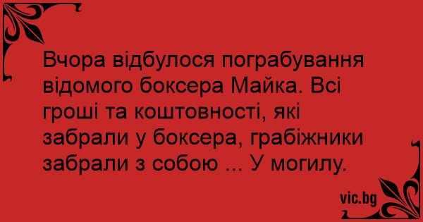 Вчора відбулося пограбування відомого боксера Майка. Всі гроші та коштовності, які забрали у боксера, грабіжники забрали з собою ... У могилу.