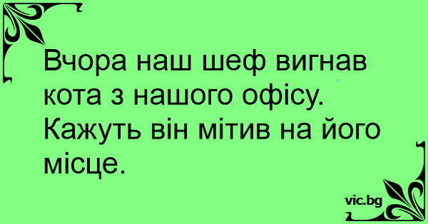Вчора наш шеф вигнав кота з нашого офісу. Кажуть він мітив на його місце.