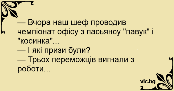 — Вчора наш шеф проводив чемпіонат офісу з пасьянсу "павук" і "косинка"...