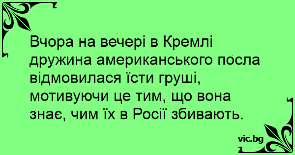 Вчора на вечері в Кремлі дружина американського посла відмовилася їсти груші, мотивуючи це тим, що вона знає, чим їх в Росії збивають.