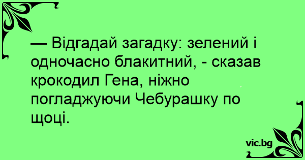 — Відгадай загадку: зелений і одночасно блакитний, - сказав крокодил Гена, ніжно погладжуючи Чебурашку по щоці.