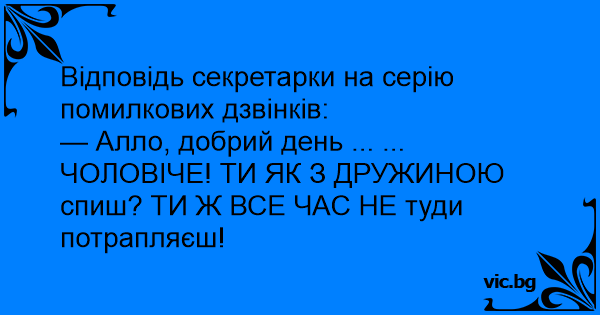 — Алло, добрий день ... ... ЧОЛОВІЧЕ! ТИ ЯК З ДРУЖИНОЮ спиш? ТИ Ж ВСЕ ЧАС НЕ туди потрапляєш!