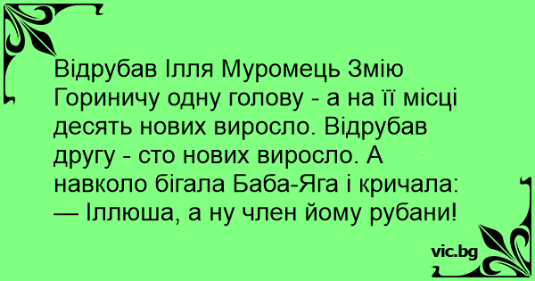 Відрубав Ілля Муромець Змію Гориничу одну голову - а на її місці десять нових виросло. Відрубав другу - сто нових виросло. А навколо бігала Баба-Яга і кричала: