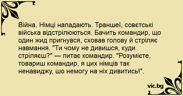 Війна. Німці нападають. Траншеї, совєтські війська відстрілюються. Бачить командир, що один жид пригнувся, сховав голову й стріляє навмання. "Ти чому не дивишся, куди стріляєш?" — питає командир. "Розумієте, товариш командир, я цих німців так ненавиджу, шо немогу на ніх дивитись!".