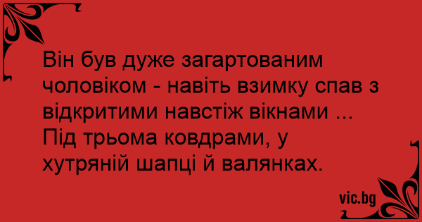 Він був дуже загартованим чоловіком - навіть взимку спав з відкритими навстіж вікнами ... Під трьома ковдрами, у хутряній шапці й валянках.