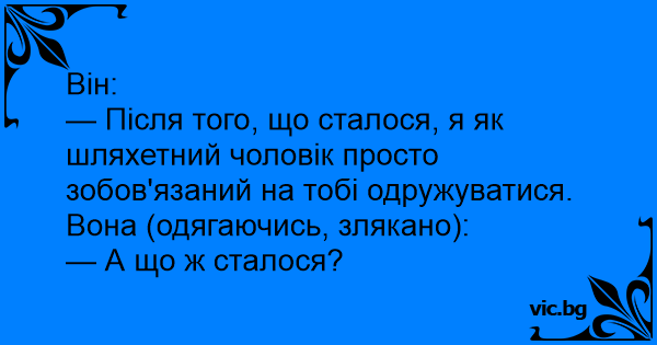 - След всичко, което стана, аз, като истински джентълмен, съм длъжен да се оженя за теб! Тя, обличайки се, уплашено: - А какво е станало?