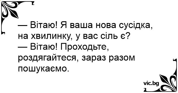 — Вітаю! Я ваша нова сусідка, на хвилинку, у вас сіль є?