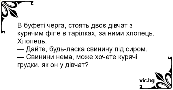 — Свинини нема, може хочете курячі грудки, як он у дівчат?