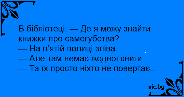 V knihovně: „Prosím vás, kde máte nějaké knihy o sebevraždách?” „Pátý regál zleva, střední police.” „Ale tam není žádná kniha!” „Vidíte, jací jsou lidi! Půjčí si a nevrátí!”