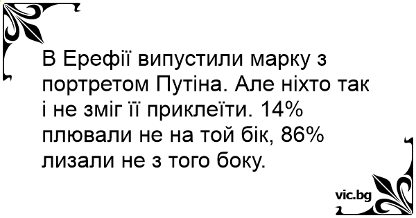 В Ерефії випустили марку з портретом Путіна. Але ніхто так і не зміг її приклеїти. 14% плювали не на той бік, 86% лизали не з того боку.