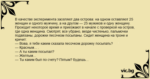 В качестве эксперимента заселяют два острова: на одном оставляют 25 женщин и одного мужчину, а на другом — 25 мужиков и одну женщину.