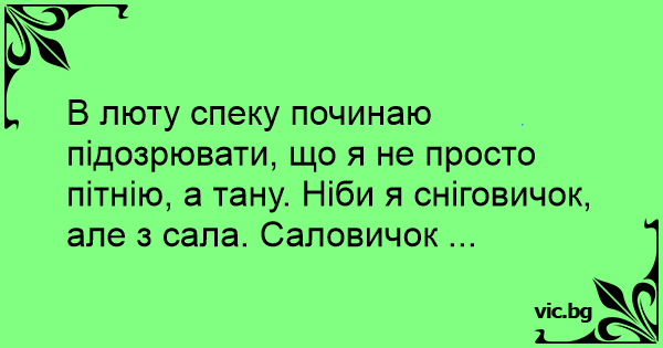 В люту спеку починаю підозрювати, що я не просто пітнію, а тану. Ніби я сніговичок, але з сала. Саловичок ...