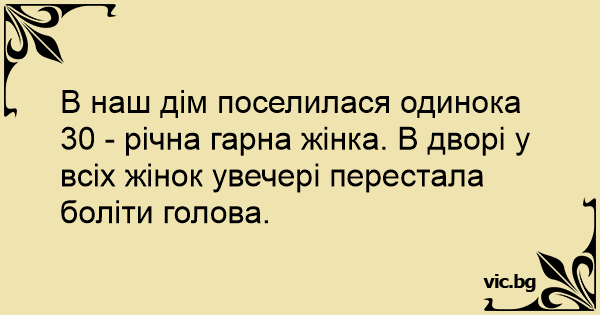 В наш дім поселилася одинока 30 - річна гарна жінка. В дворі у всіх жінок увечері перестала боліти голова.