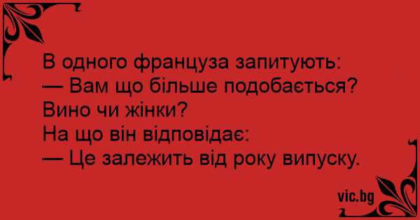 — Що ти більше любиш – вино чи жінок? — Це залежить від року виготовлення.
