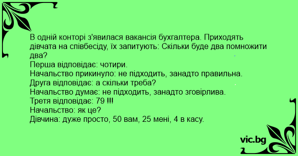 В одній конторі з'явилася вакансія бухгалтера. Приходять дівчата на співбесіду, їх запитують: Скільки буде два помножити два?