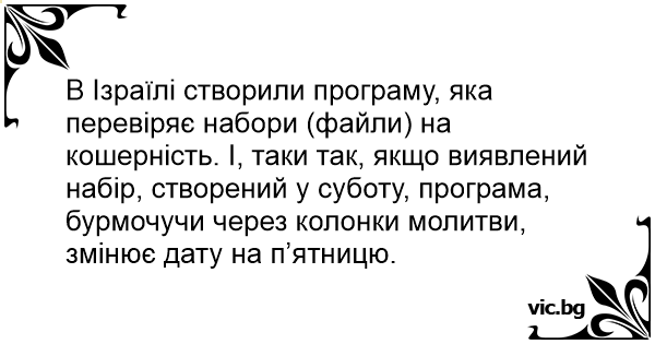 В Ізраїлі створили програму, яка перевіряє набори (файли) на кошерність. І, таки так, якщо виявлений набір, створений у суботу, програма, бурмочучи через колонки молитви, змінює дату на п’ятницю.