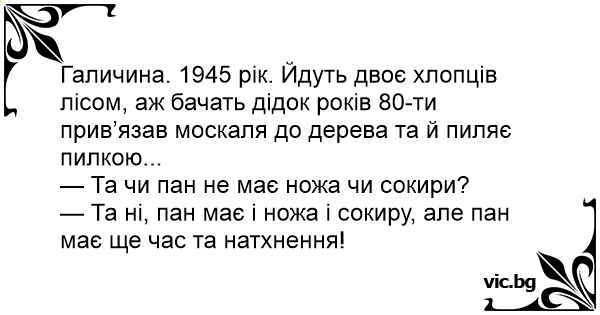 Галичина. 1945 рік. Йдуть двоє хлопців лісом, аж бачать дідок років 80-ти прив’язав москаля до дерева та й пиляє пилкою...
