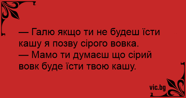 — Мамо ти думаєш що сірий вовк буде їсти твою кашу.