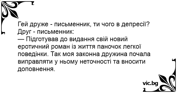 — Підготував до видання свій новий еротичний роман із життя паночок легкої поведінки. Так моя законна дружина почала виправляти у ньому неточності та вносити доповнення.