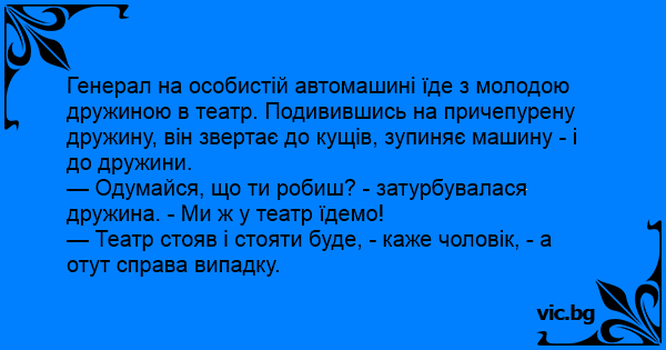 Генерал на особистій автомашині їде з молодою дружиною в театр. Подивившись на причепурену дружину, він звертає до кущів, зупиняє машину - і до дружини.