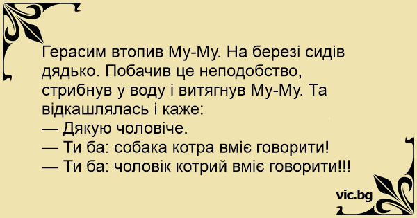 Герасим втопив Му-Му. На березі сидів дядько. Побачив це неподобство, стрибнув у воду і витягнув Му-Му. Та відкашлялась і каже: