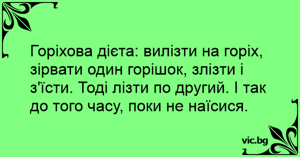Горіхова дієта: вилізти на горіх, зірвати один горішок, злізти і з'їсти. Тоді лізти по другий. І так до того часу, поки не наїсися.