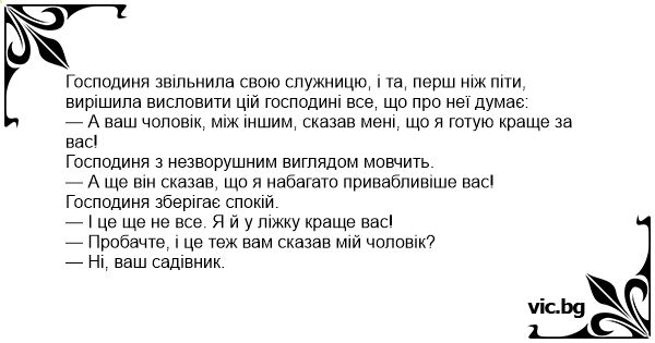 — А ваш чоловік, між іншим, сказав мені, що я готую краще за вас!