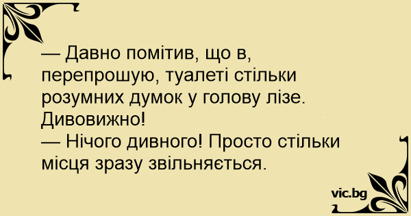 — Давно помітив, що в, перепрошую, туалеті стільки розумних думок у голову лізе. Дивовижно!