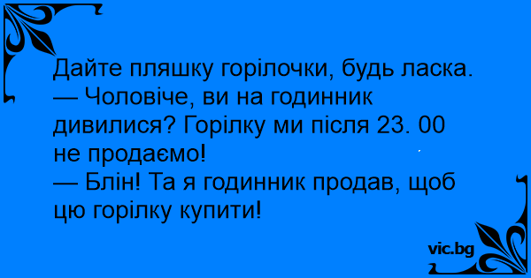 — Чоловіче, ви на годинник дивилися? Горілку ми після 23. 00 не продаємо!
