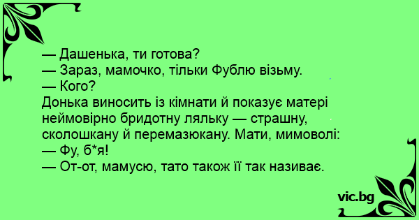 Донька виносить із кімнати й показує матері неймовірно бридотну ляльку — страшну, сколошкану й перемазюкану. Мати, мимоволі: