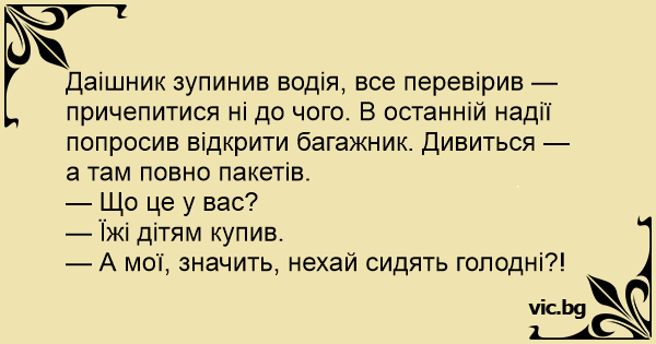 Даішник зупинив водія, все перевірив — причепитися ні до чого. В останній надії попросив відкрити багажник. Дивиться — а там повно пакетів.