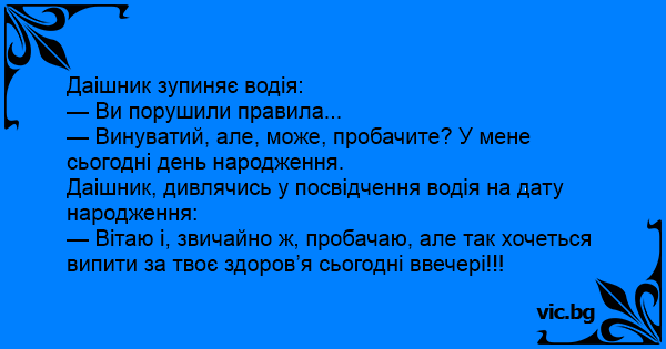 Даішник зупиняє водія: — Ви порушили правила... — Винуватий, але, може, пробачите? У мене сьогодні день народження. Даішник, дивлячись у посвідчення водія на дату народження: — Вітаю і, звичайно ж, пробачаю, але так хочеться випити за твоє здоров’я сьогодні ввечері!!!