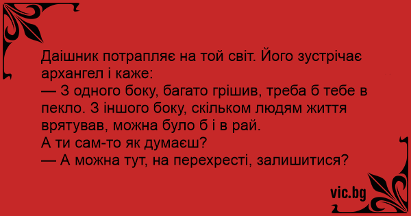 — З одного боку, багато грішив, треба б тебе в пекло. З іншого боку, скільком людям життя врятував, можна було б і в рай.