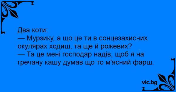 — Мурзику, а що це ти в сонцезахисних окулярах ходиш, та ще й рожевих?
