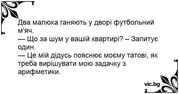 — Це мій дідусь пояснює моєму татові, як треба вирішувати мою задачку з арифметики.