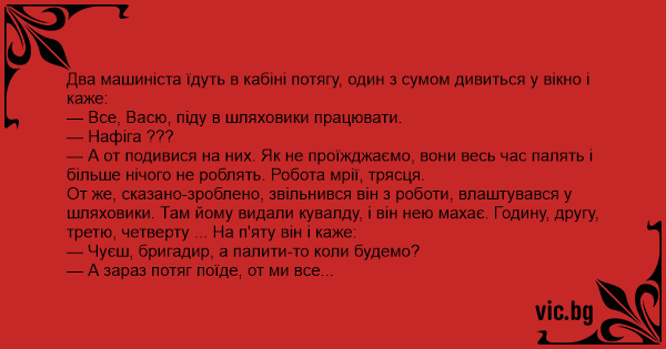 Два машиніста їдуть в кабіні потягу, один з сумом дивиться у вікно і каже: